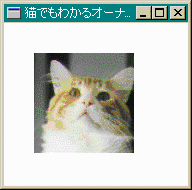 では、さっそくサンプルのプログラムを作ってみましょう。 今回は、大きなボタン(100*100)を1つ作って これに、猫のBMPを描画します。そして、このボタンが 押される度に猫の絵が変わるというものです。