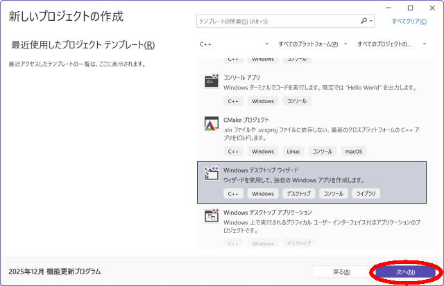 ↑新しいプロジェクトの作成ダイアログが出てくるので、Windowsデスクトップウィザードを選択します。