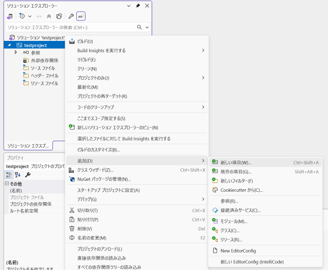 ↑「ソリューション・エクスプローラ」のプロジェクト名を右クリックします。